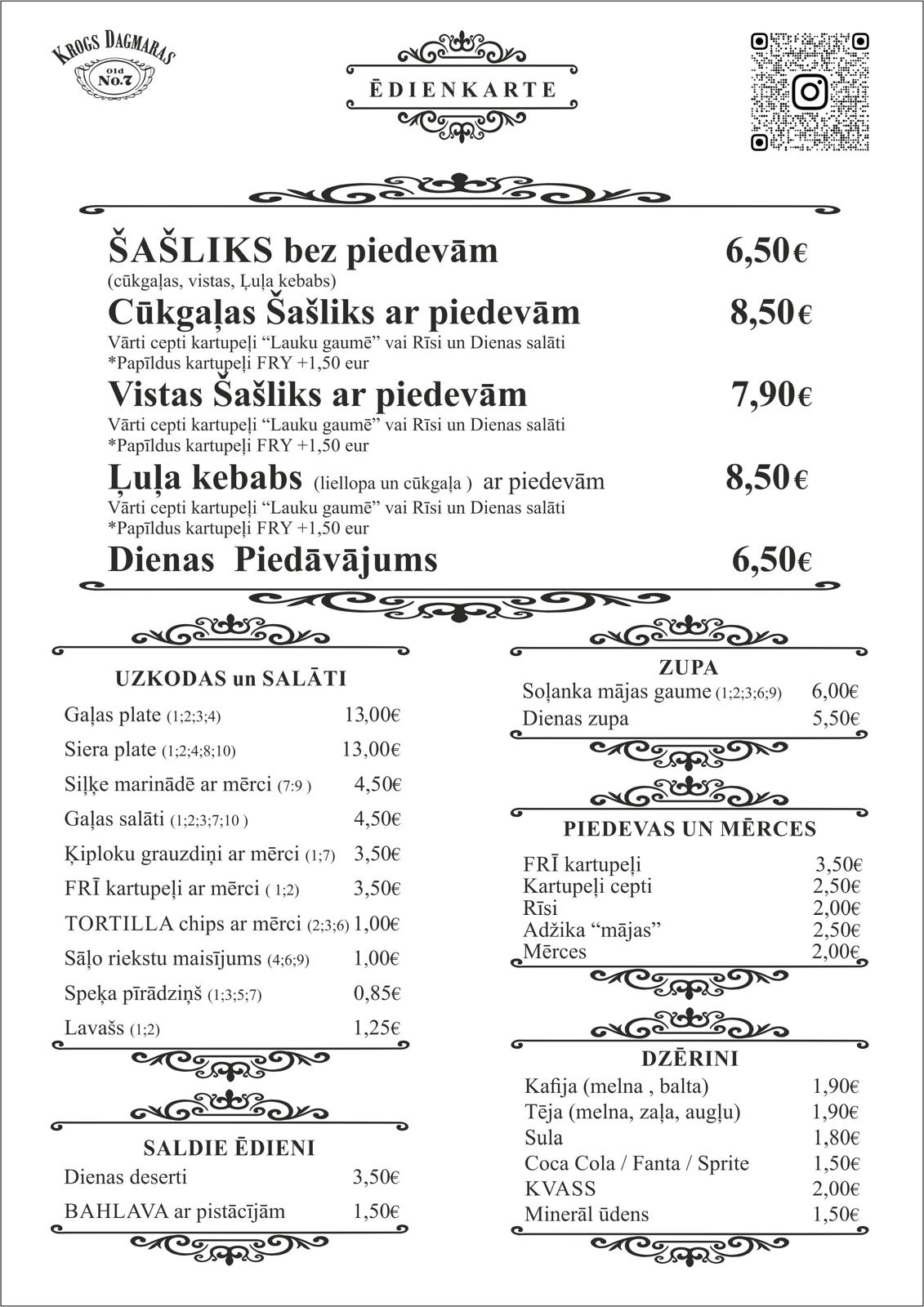 Lepojamies, ka mūsu kafejnīcā katrs viesis var atrast savai gaumei atbilstošu ēdienu. Mūsu pavāru komanda pastāvīgi pilnveido savas prasmes, lai iepriecinātu jūs ar jauniem kulinārijas atklājumiem. Ēdienus veidojam ar mīlestību un rūpēm, lai Jūs varētu izbaudīt katru kopā ar mums pavadīto mirkli.